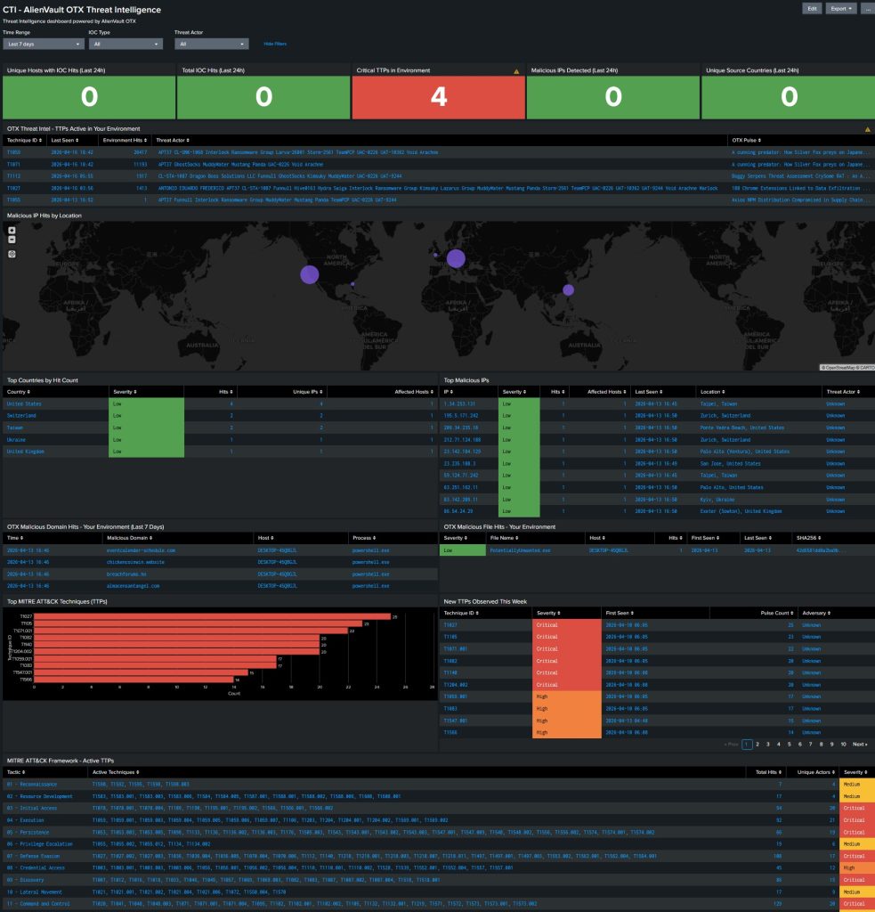 Also, the TA-otx add-on polls hourly. In a real SOC environment you would replace that with TAXII 2.1 to receive indicator pushes in real time the moment OTX publishes them. You would also use Splunk Enterprise Security’s native Threat Intelligence framework instead of raw subsearch joins, and replace the hardcoded MITRE tactic mapping with ES’s maintained lookup table.